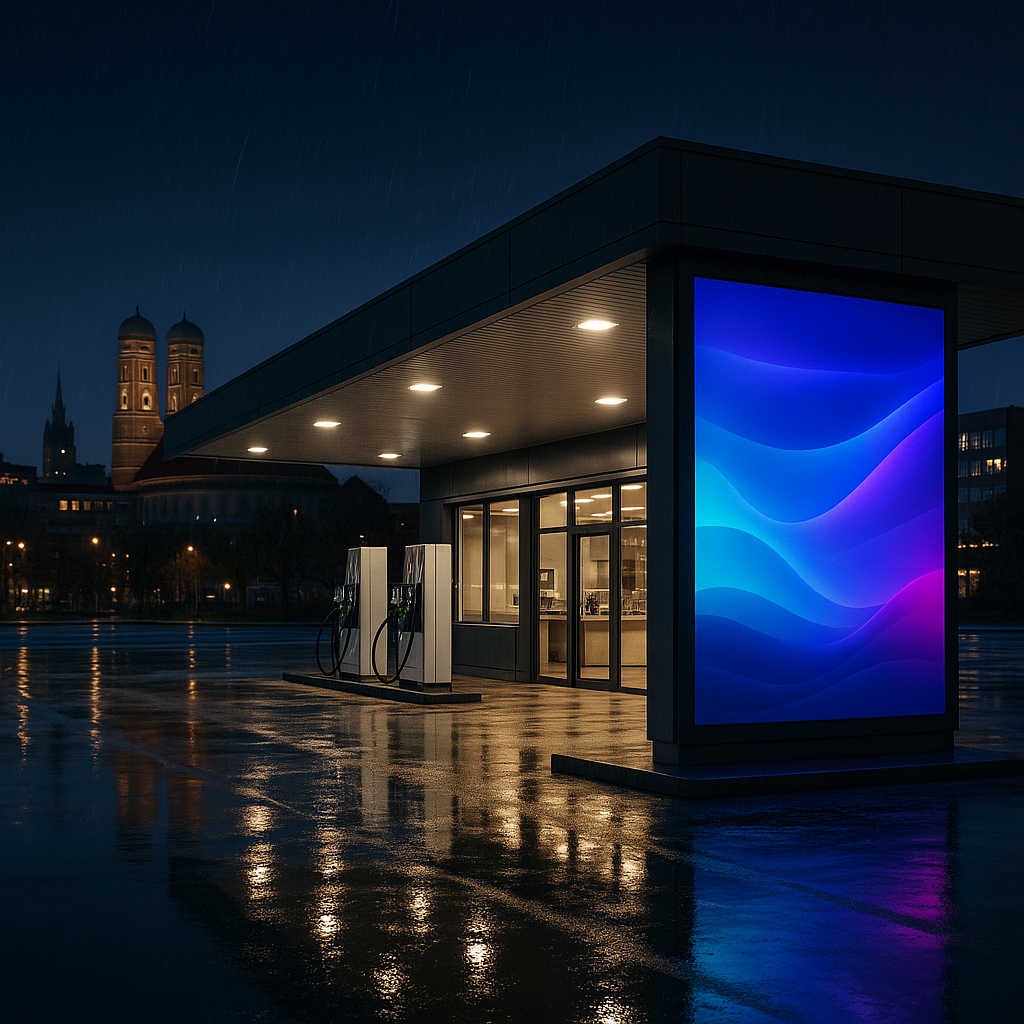 Mit dem brillant leuchtenden und auffallend großen Direct LED Bildschirm auf dem Forecourt ist Ihre Werbung auf der gesamten Außenfläche der Tankstelle sichtbar – beim Anfahren der Tankstelle, während des Tankvorgangs und auf dem Weg zum Shop.